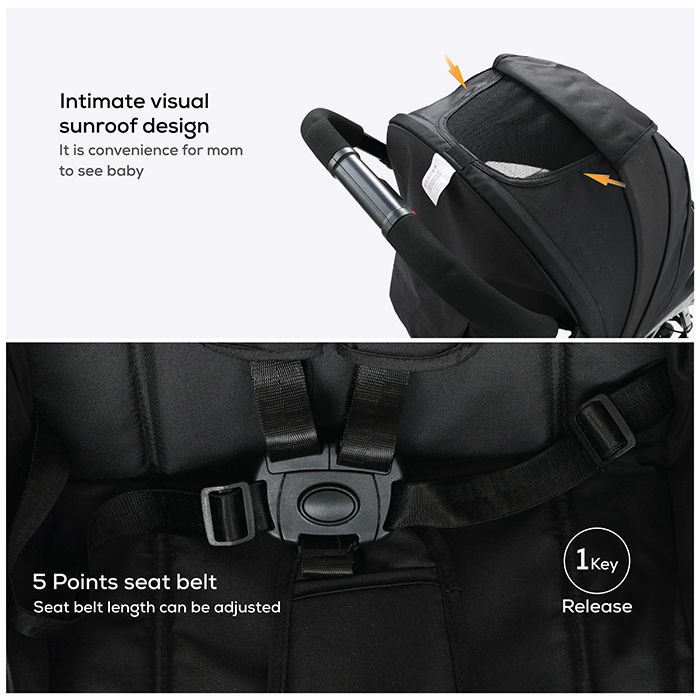 The wide foldable canopy, crafted from premium UPF 50+ fabric, offers reliable sun protection, helping you and your child enjoy every outdoor moment with peace of mind.