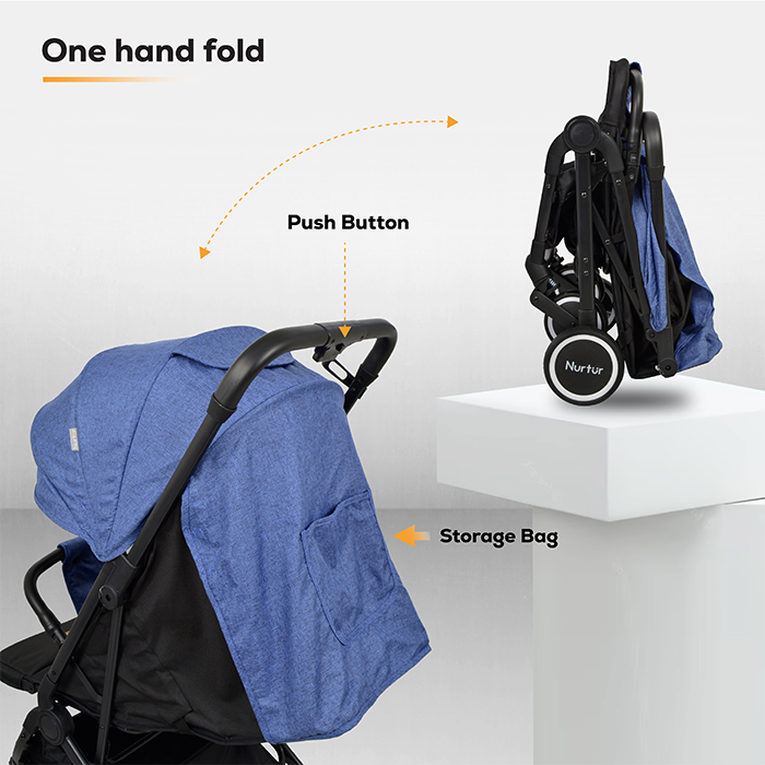 Nurtur Bravo Baby/Kids Travel Stroller 0 36 months, Storage Basket, Detachable Bumper, 5 Point Safety Harness, Compact Foldable Design, Blue