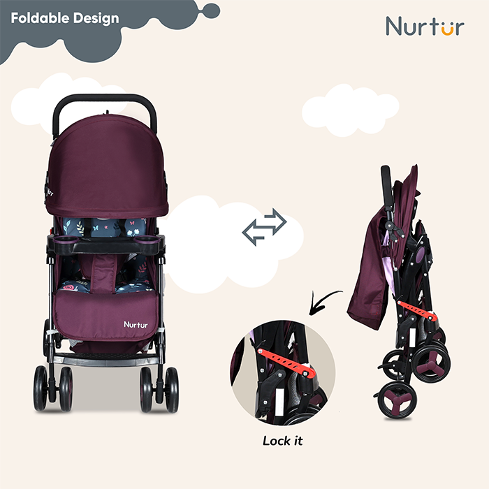 Nurtur Ryder Ultra Compact Lightweight Baby Travel Stroller with Storage Basket, Detachable Food Tray, Reclining Seat and Leg Rest, 0-36 Months, , Burgundy Printed